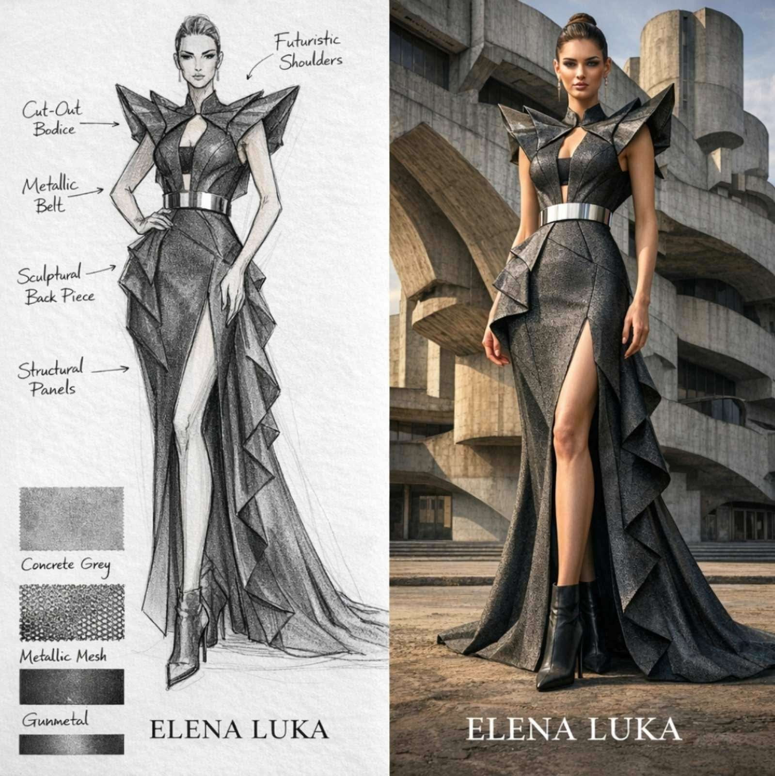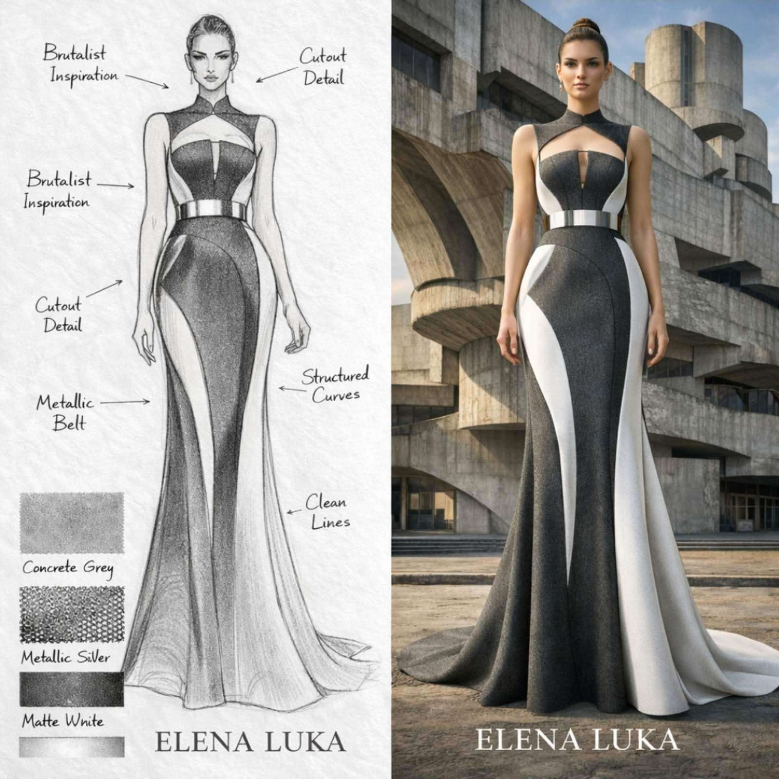Брутализмот, како правец, често е погрешно сфатен поради своето име. Тој не е брутален по карактер, туку искрен по материјал. Потекнува од францускиот израз béton brut – суров бетон – и токму таа суровост ме инспирира во моден контекст. Неполираните површини, масивните волумени, јасните линии и функционалноста без извинување создаваат естетика што лесно може да се преведе во крој, текстура и силуета.
