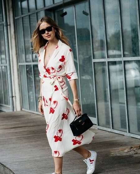Бел фустан на преклоп со цветен, црвен принт комбинираме со бели патики и добиваме комфорен…