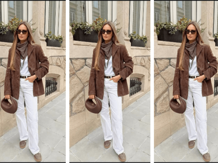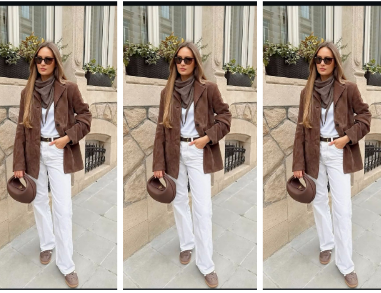 Денешниот стајлинг го боиме во кафено бел тон. Предложуваме бели фармерки со класичен крој и блуза во иста боја. Дополнуваме со кафеава јакна од превртена кожа и патики во слична нијанса. Финишираме…
