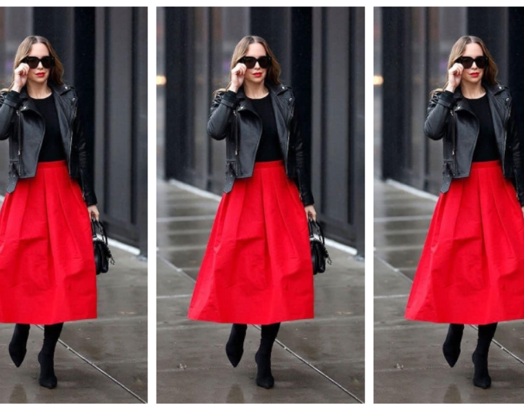 Пред крајот на работната недела го разигруваме стајлингот со широко, миди, црвено здолниште. Ова парче облека го дополнуваме со црна блуза и црна кожна јакна. Финишираме со црни чизми на навлекување и…