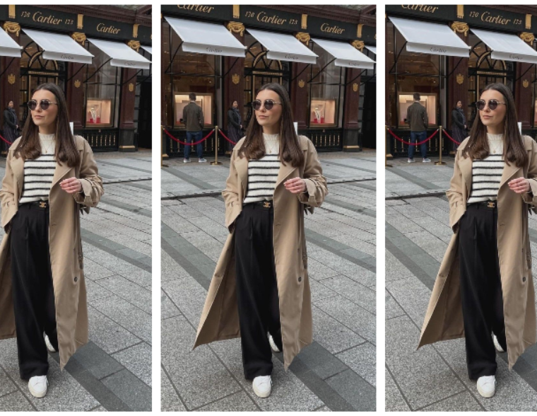 Денешниот ден го започнуваме со класичен беж мантил. Ова пролетно парче облека го комбинираме со црни панталони и блуза на црно-бели риги. Стајлингот го заокружуваме со бели патики. Имајте среќна среда.