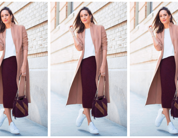 Понеделнички стартуваме со миди, бордо здолниште во комбинација со бела блуза. Овие две парчиња облека ги дополнуваме со памучен мантил во пудреста нијанса. Финишираме со бели патики и двобојна чанта од велур.…
