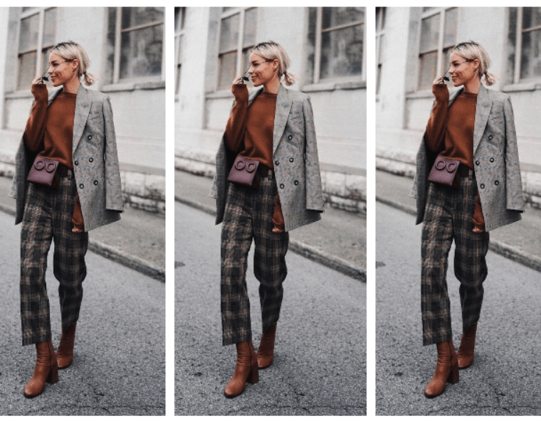 Вторник е ден за карирани панталони во сиви нијанси коишто ги комплетираме со кафеав џемпер. Стајлингот го дополнуваме со сив блејзер и кафеави чизми на потпетица. Заокружуваме со мини бордо чанта. Ви…