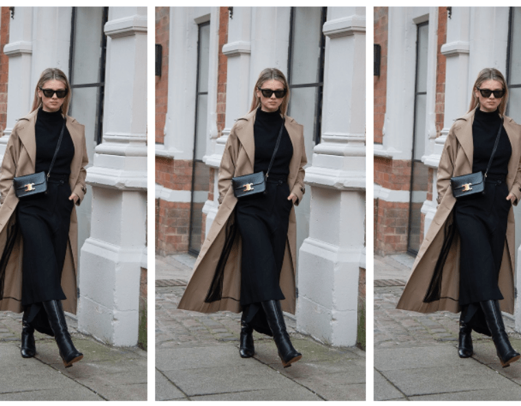 Четврток е ден за црно здолниште во комбинација со ролка во иста боја. На оваа спојка додаваме беж мантил и црни, високи чизми на потпетица. Финишираме со ремен и мала, црна чанта.…