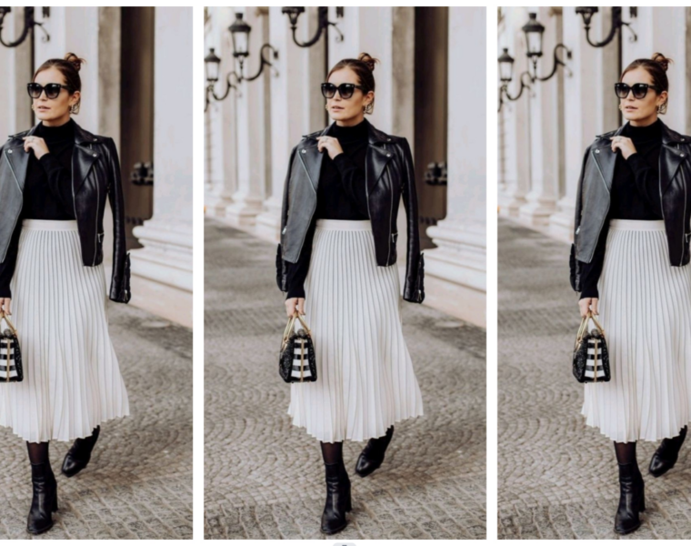 Петочкиот стајлинг ни е обоен црно-бело. Како за пред викенд имаме комбинација од бело плисирано здолниште, црна ролка и кожна јакна. На овие парчиња додаваме црни чизми над глужд и црно-бела чанта.…