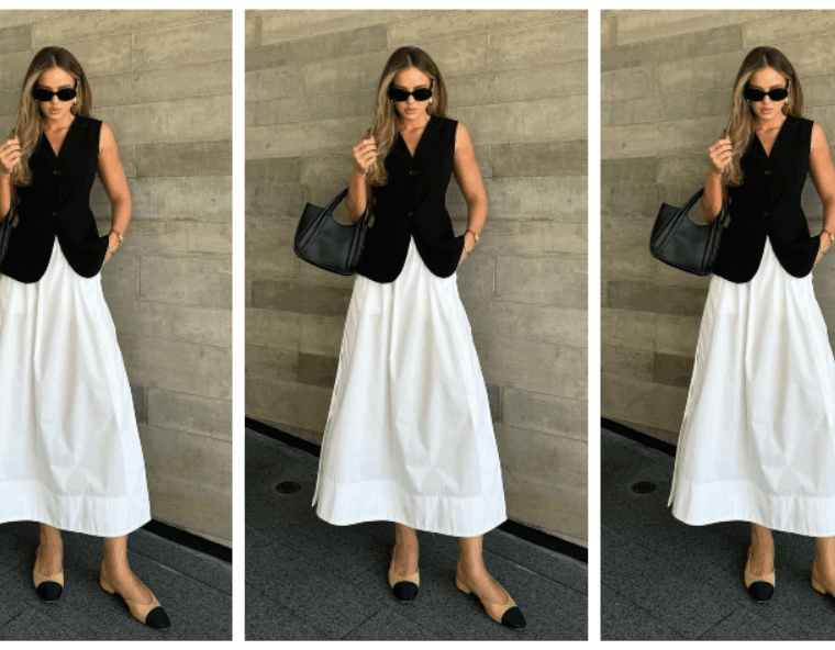 Оваа топла работна недела ја започнуваме со класична црно бела комбинација. Понеделнички предложуваме бело макси здолниште коешто го спојуваме со црн елек. Дополнуваме со кремаво-црни чевли, црна чанта и задолжително носиме очила…
