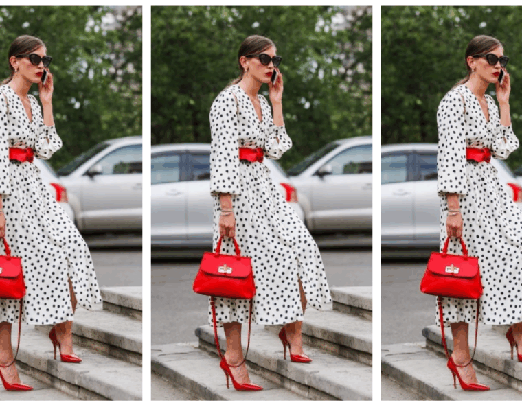 За овој вторник предложуваме фустан со полка точки и широки ракави. Ова елегантно парче облека го комбинираме со црвени потпетици и ремен во иста боја. Денешниот стајлинг го заокружуваме со црвена чанта…