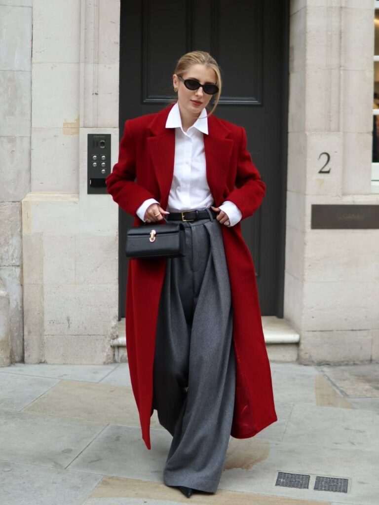 Четврток е за црвен капут Денешниот четврток го резервираме за широки сиви панталони во комбинација со класична бела кошула. Оваа спојка ја дополнуваме со макси капут во темно црвена нијанса. Финишираме со мини, црна чанта и црни потпетици. Ви посакуваме убав ден. Previous Article На 80 години изгледа подобро од кога било – тајната на Џеклин Смит Next Article Дали Vogue сеуште е кралот на модните списанија што и понатаму држи примат во светот на високата мода?