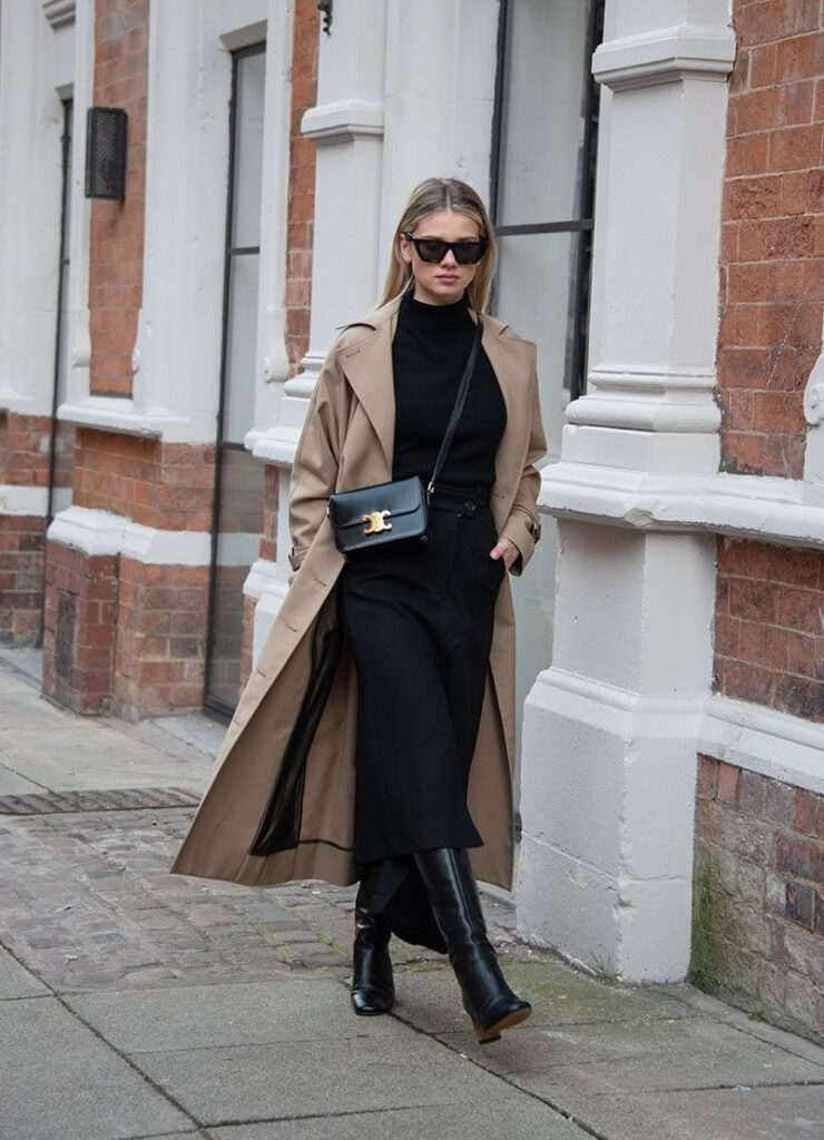 На оваа спојка додаваме беж мантил и црни, високи чизми на потпетица.
