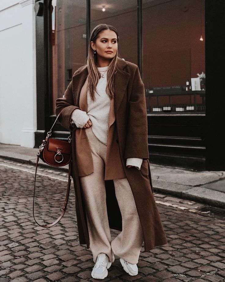 За да се згрееме имаме макси капут, а аутфитот го разигруваме со бели патики.