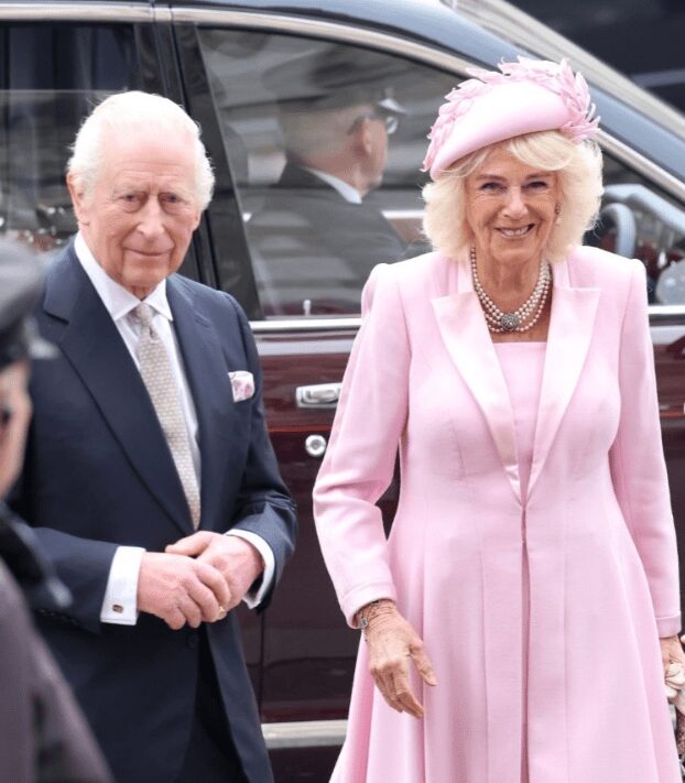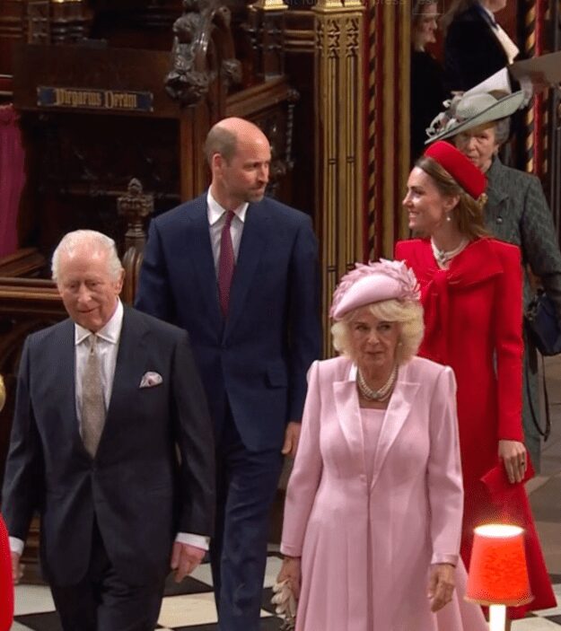 Наспроти смелиот избор на Кејт, кралицата Камила се појави во комбинација во пастелно розова боја, оставајќи впечаток на софистицирана женственост. Таа носеше мантил од модната дизајнерка Fiona Clare, украсен со сатенски ревер и крој кој грациозно паѓа од половината надолу. Овој романтичен и префинет изглед го надополни со елегантна беретка во истата нијанса и светла чанта од Fendi, совршено комбинирајќи кралска традиција со модерен стил.