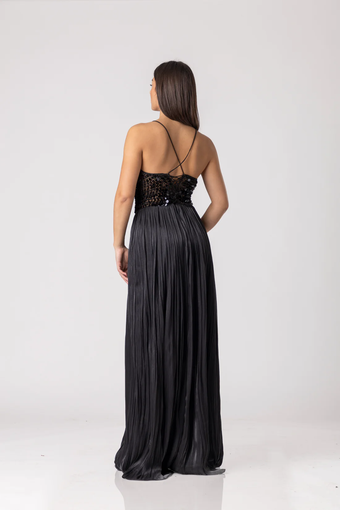 ORVEAL Рачно аплицирани пајети, флуидна здолнишна линија со висок шлиц, тенки прерамки за леснотија и елеганција, минималистички драматична силуета.