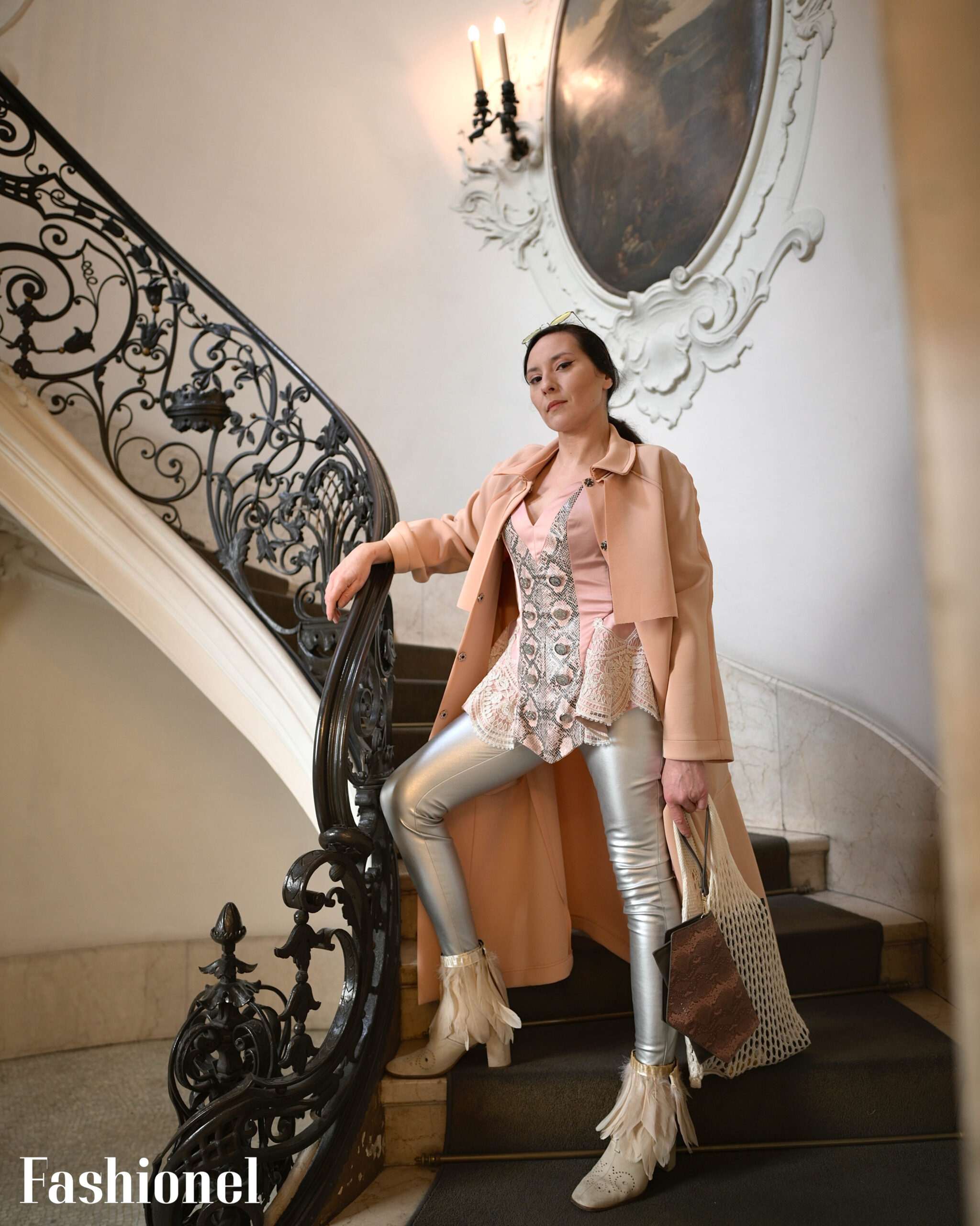 За вакво едно патешествие ни беше потребен интригантен стајлинг, со парчиња кои, како и мислите, секое раскажува своја приказна, но склопени заедно значат интрига која нè тера на размислување. Во центарот на вниманието е невообичаениот корсет од брендот EЛЕНА ЛУКА, струкиран со лелеави колкови, со змиски принт и детали на сребрени копчиња кои се внимателно лоцирани, а секој елемент кој го опишува е компониран со посебно парче. Сребрените панталони се во дует со копчињата, спарениот змиски принт на геометриската чантичка си поигрува графички со романтичноста, пердувите детал на чевлите ја надополнуваат разиграната форма, а плетената торба се испреплетува со тантелата во истиот тон. Мантилот од брендот „ЕЛЕНА ЛУКА“ од неопрен, преку своите карактеристики на материјал, нијанса и форма, ги прегрнува сите елементи во една комплетна приказна.