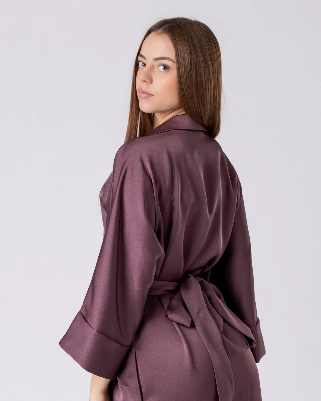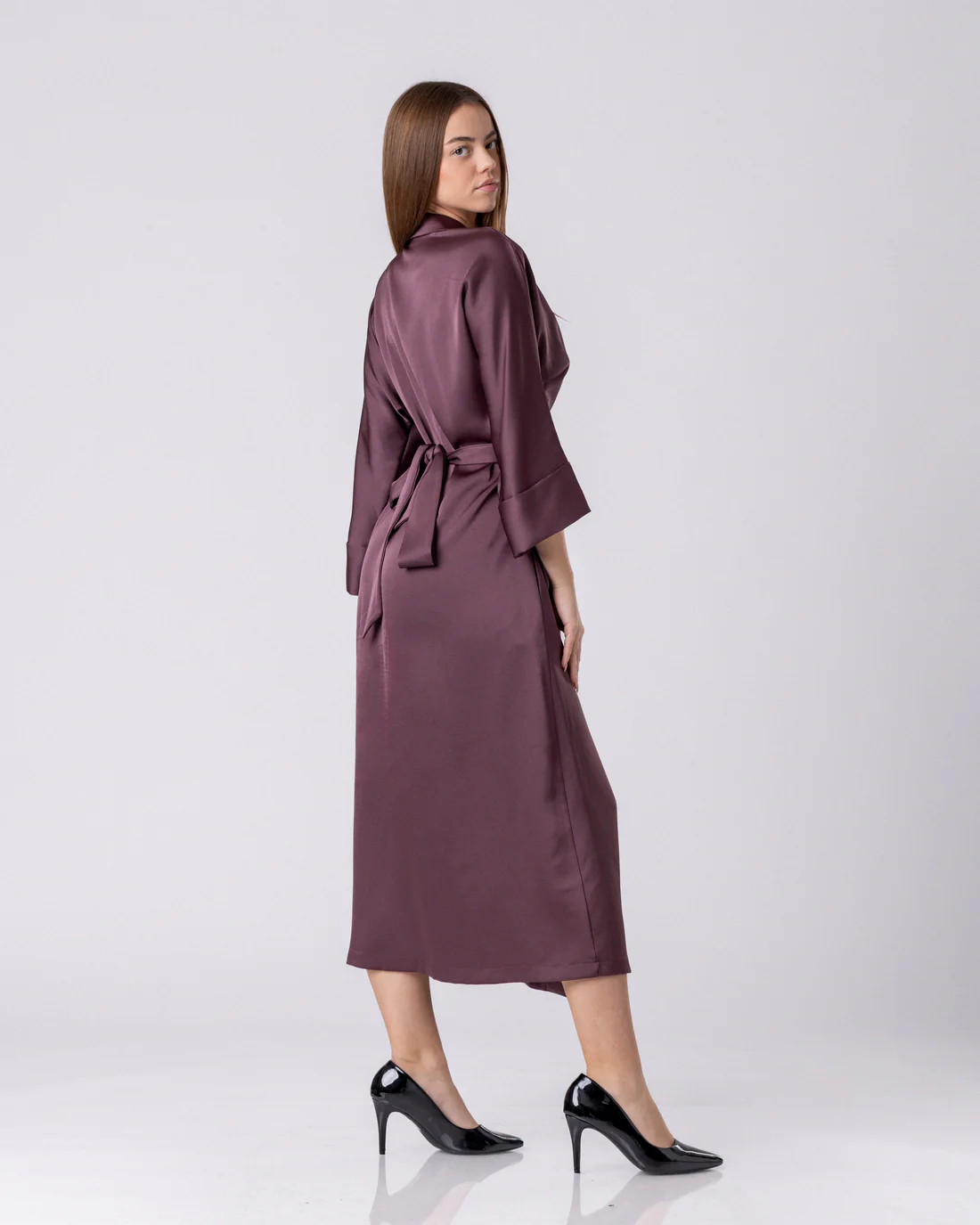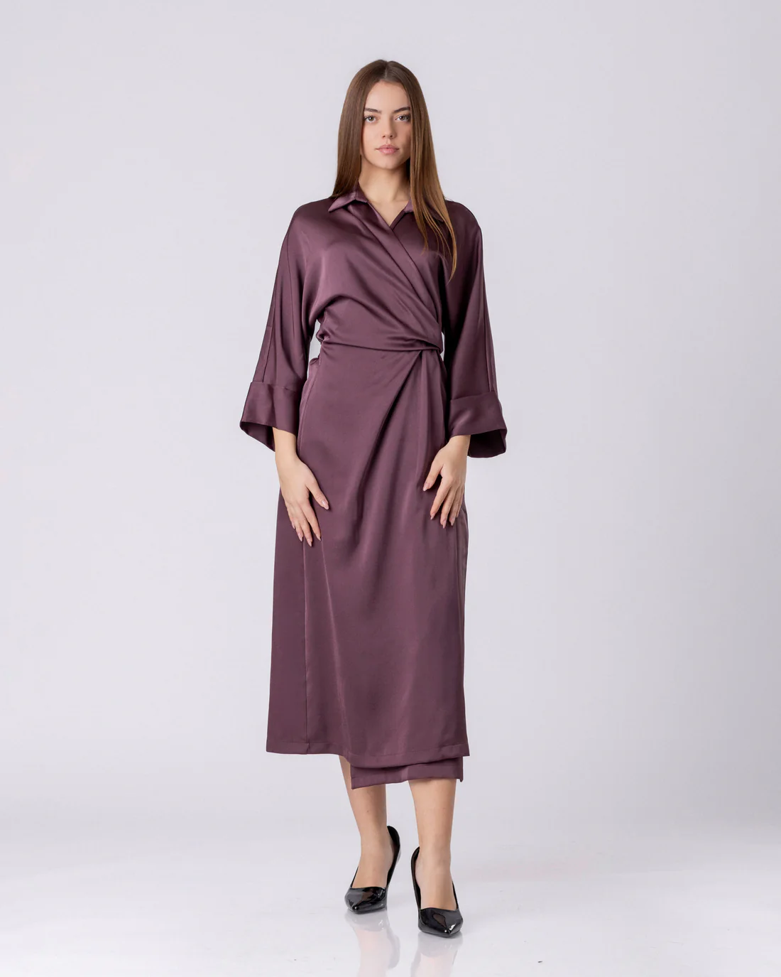 Изработен од флуиден премиум сатен со мек и суптилен сјај, фустанот се движи со телото со леснотија што потсетува на шепот. Неговата текстура нежно ја следи линијата на фигурата, додека модерниот крој на преклопување создава ефект на природно стеснување во половината. Резултатот е силуета што делува статуарно и издолжено, без притоа да ја наруши удобноста.