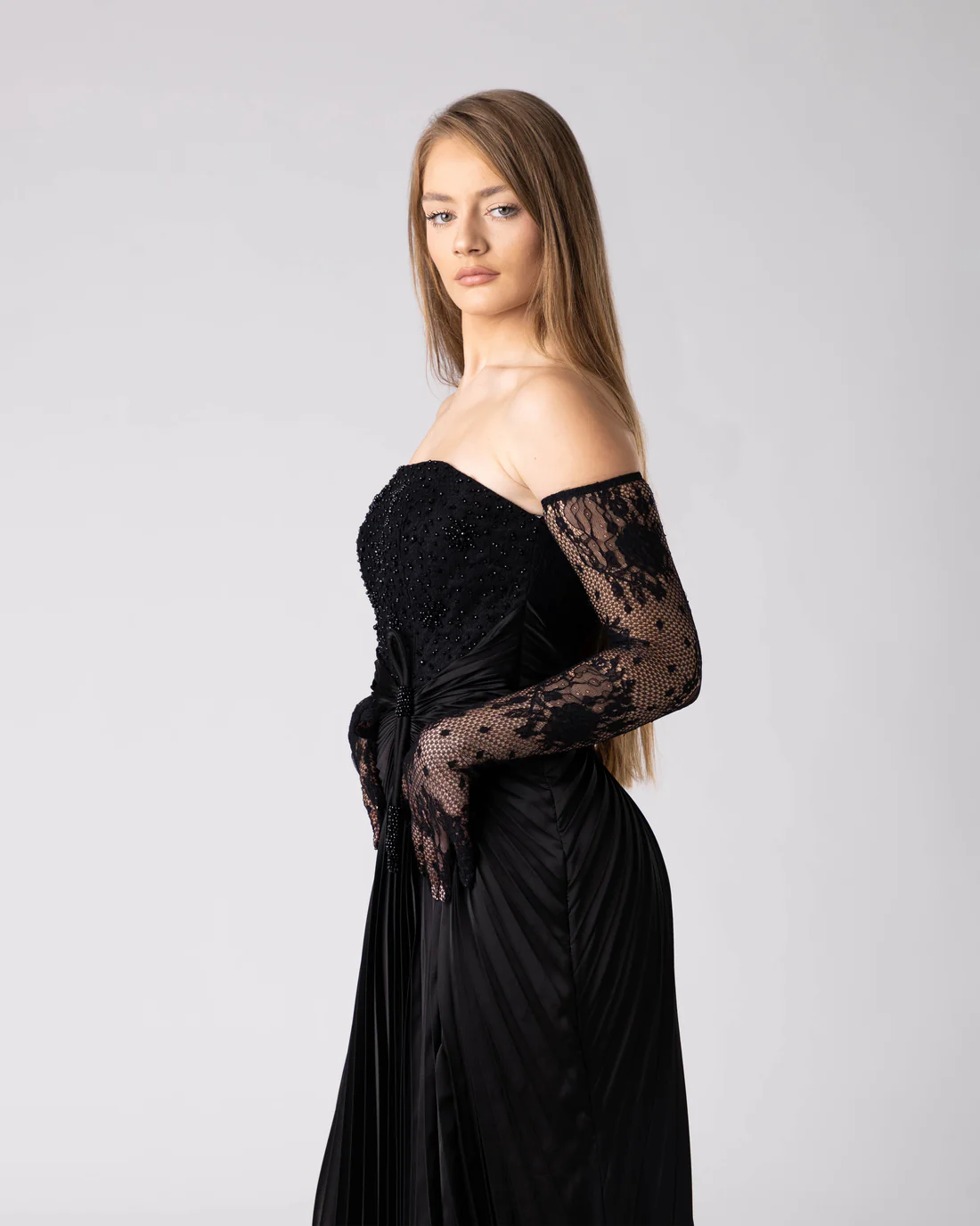 Овој долг вечерен фустан е изграден врз прецизна конструкција и внимателно избалансиран дизајн. Горниот дел плени со чисто дефинирано деколте, надополнето со рачно аплицирани, суптилни детали што внесуваат длабочина без да ја нарушат минималистичката естетика. Долгите чипкани ракавици создаваат игра на транспарентност и текстура, давајќи му на моделот нежна, но впечатлива димензија.
