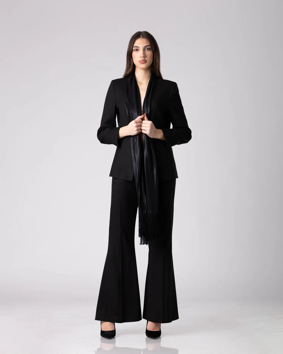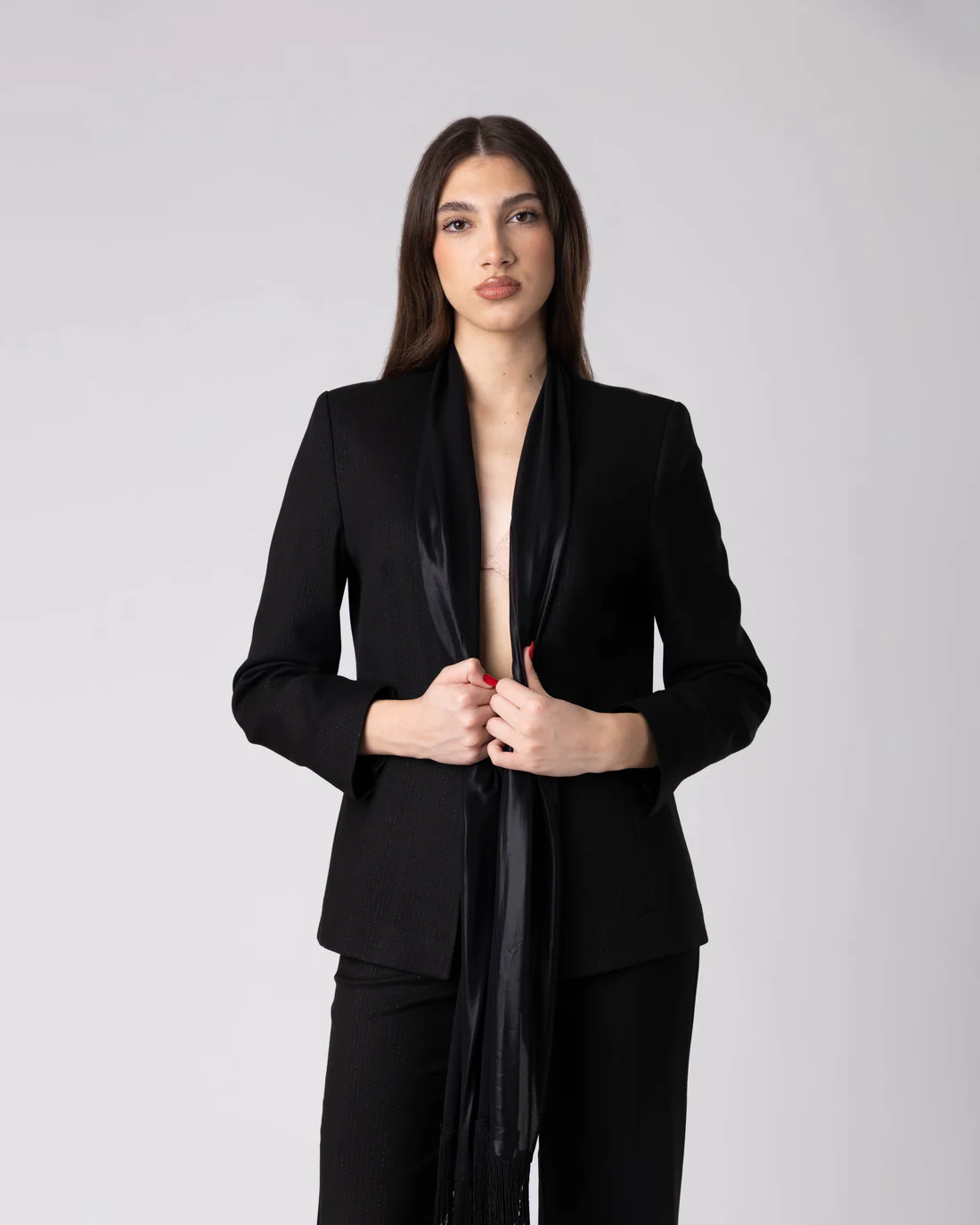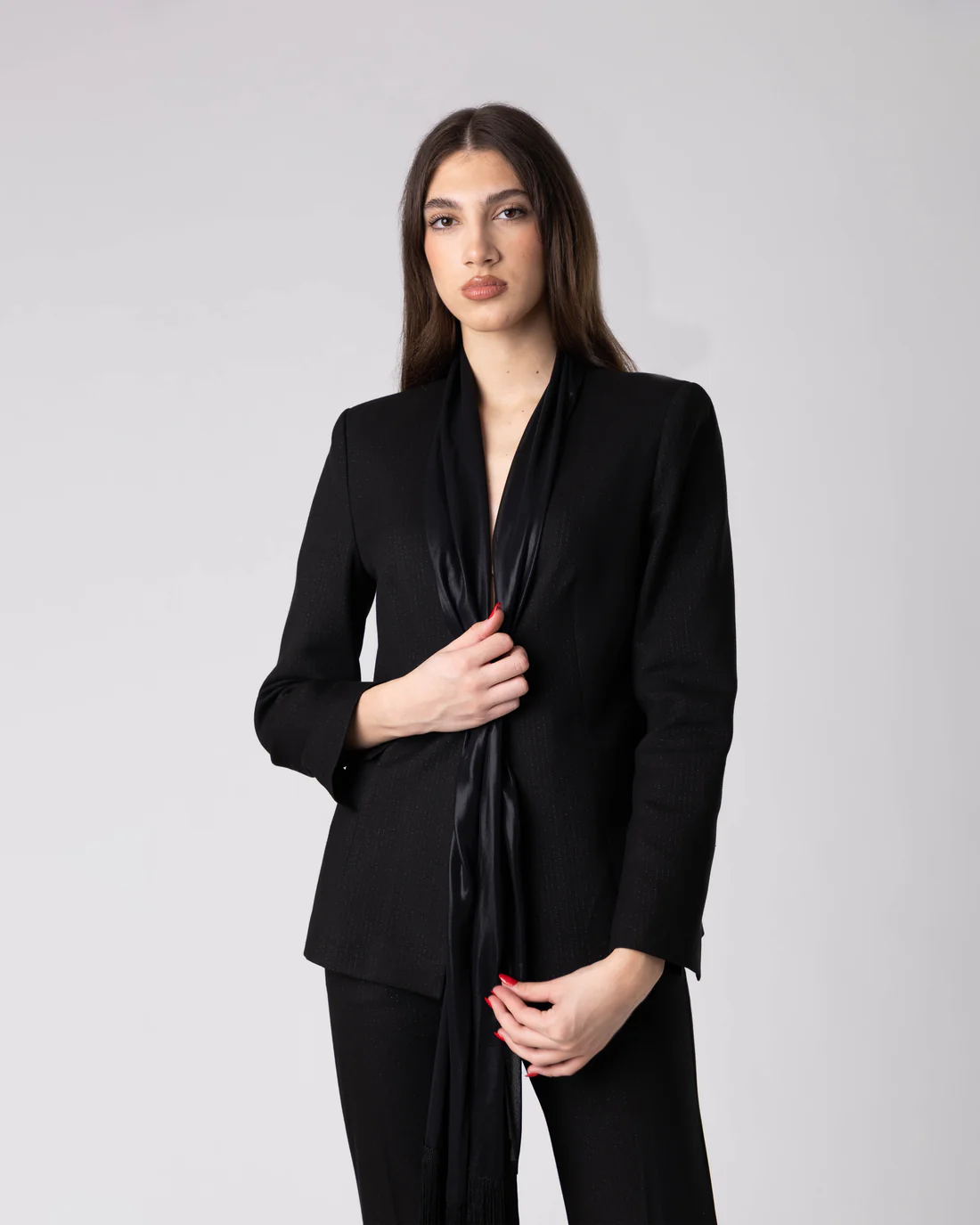 Дизајнирано како силно базично парче, ова сако лесно се трансформира, од дневна елеганција со деловен карактер, до вечерен изглед со софистицирана нота. Неговата адаптибилност го прави неопходен дел од гардеробата на модерната жена.