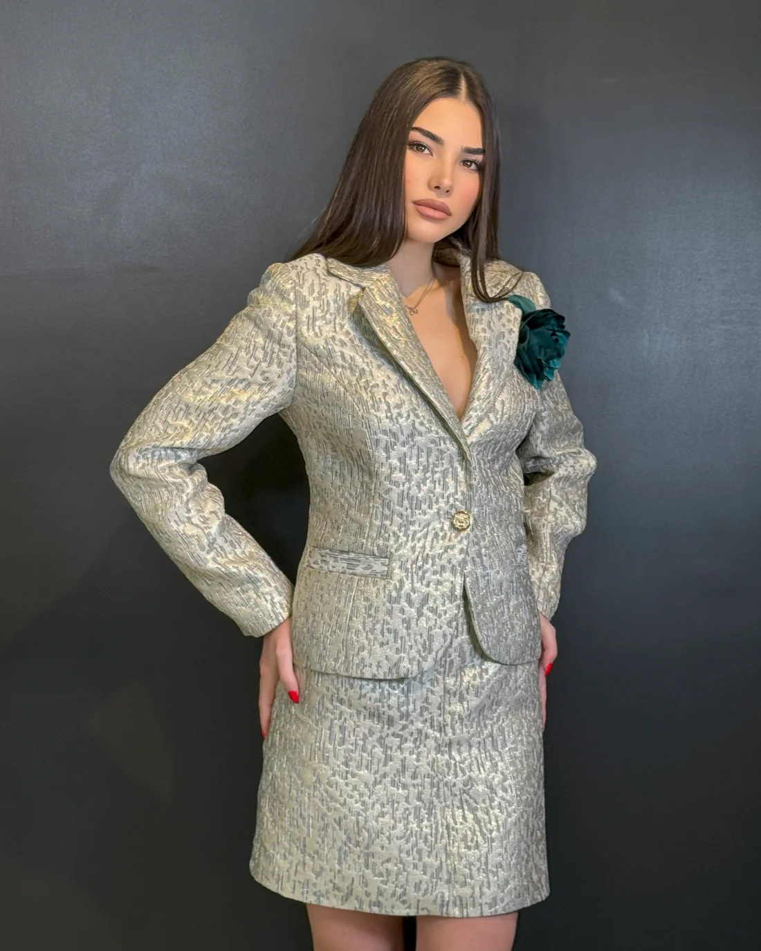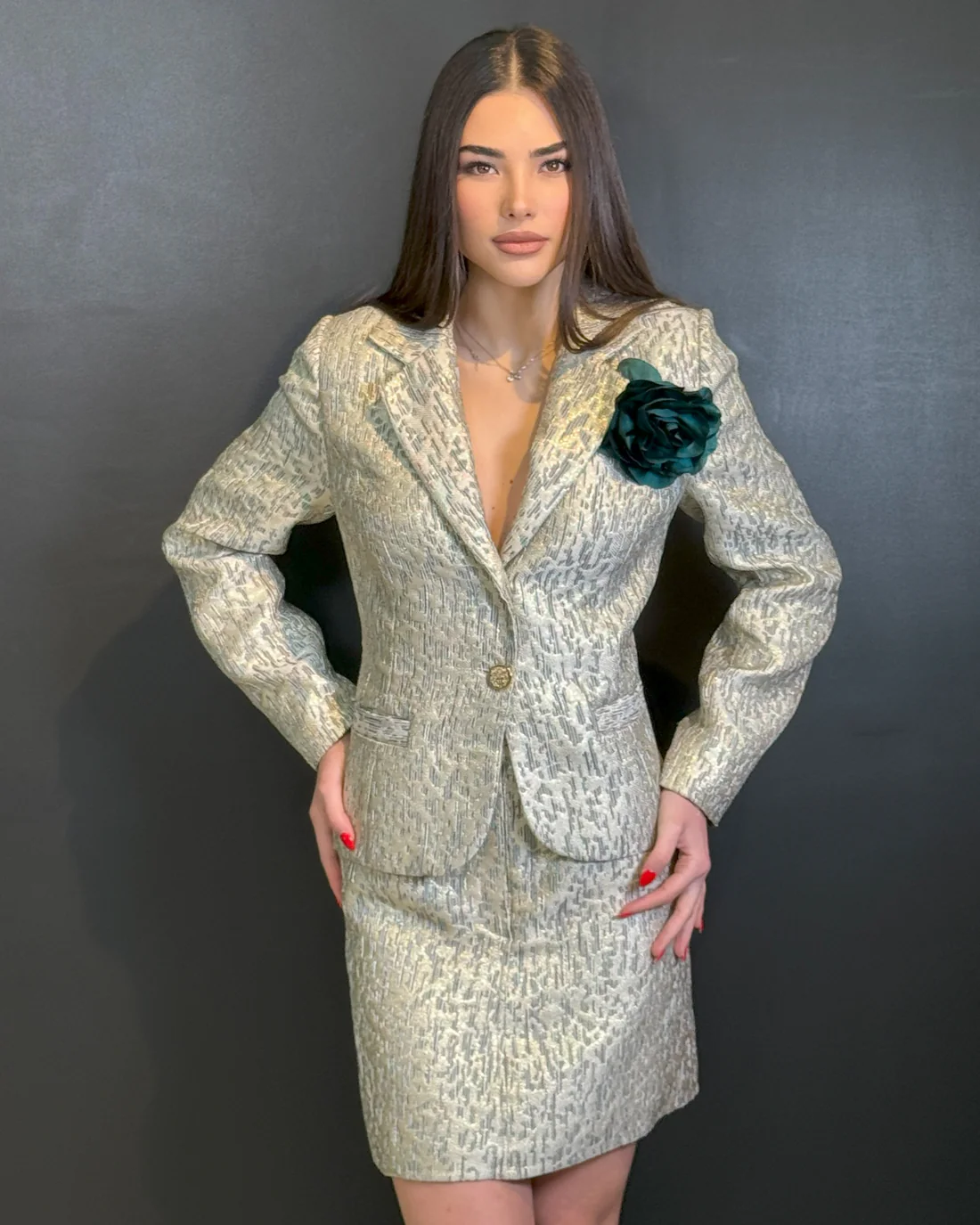 Дводелен сет наречен Regal Poise Brocade Set е составен од струкирано сако и мини здолниште, изработени од луксузен брокат со суптилен сјај. Ткаенината има богата текстура која веднаш асоцира на couture естетика и елитен стил, додека светкавите тонови дополнително ја нагласуваат софистицираноста на моделот.