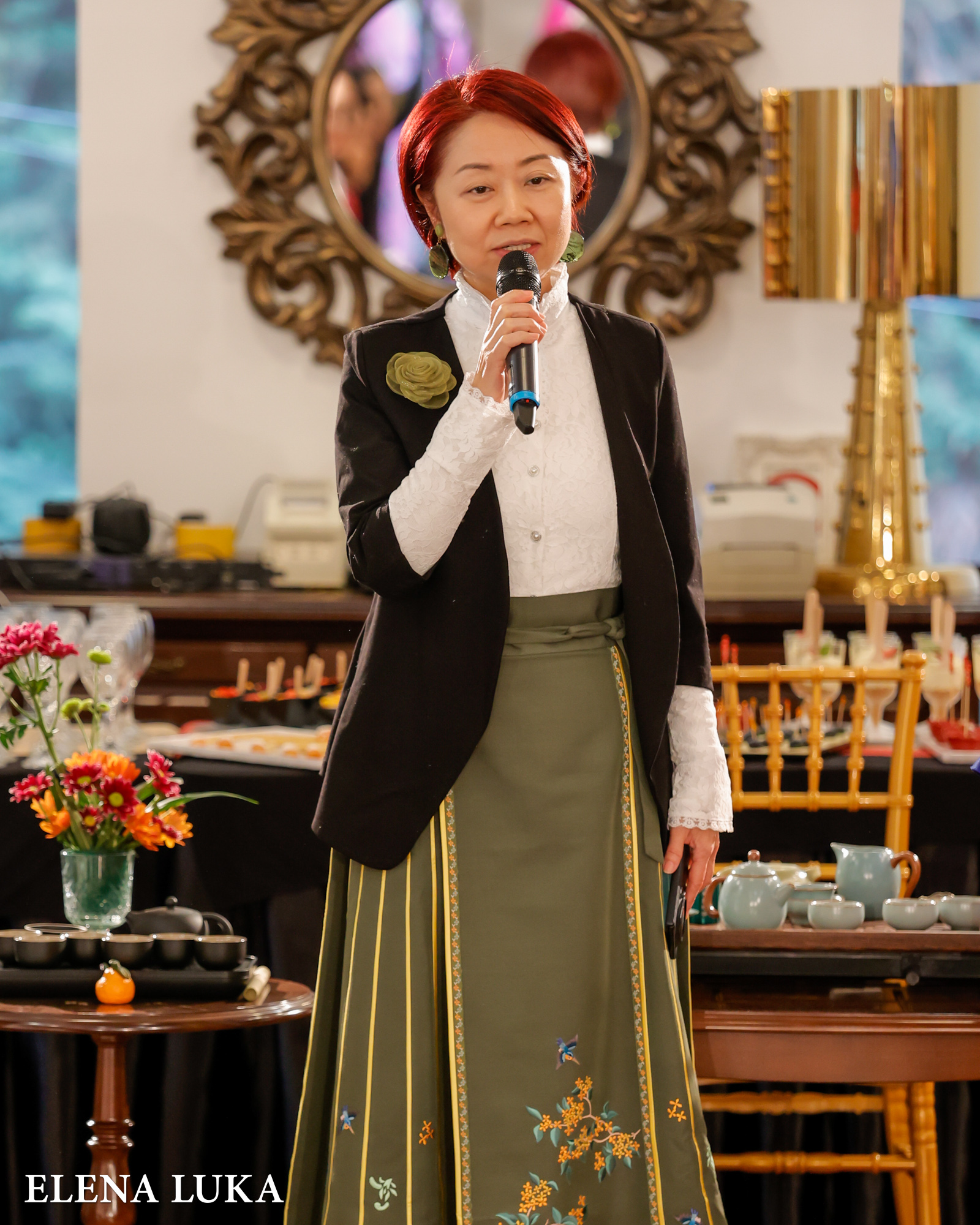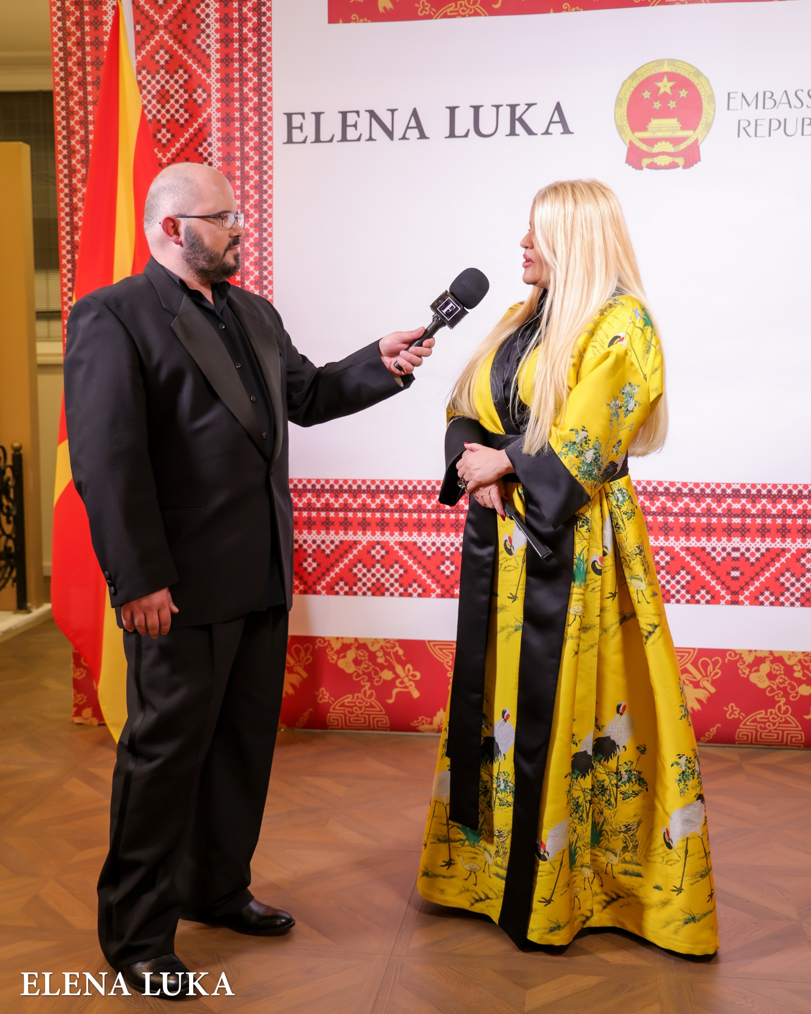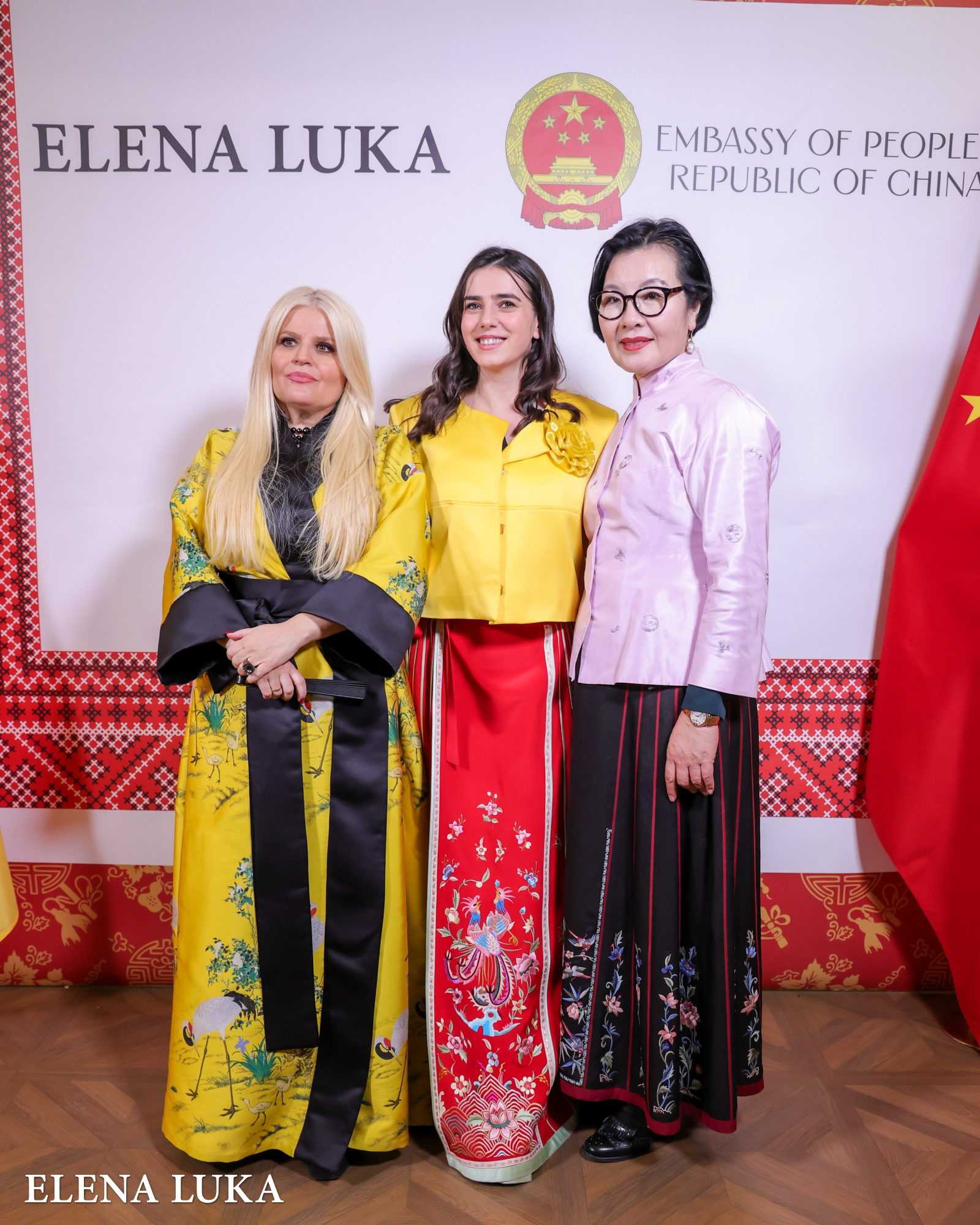 Г-ѓа Елена Лука блескаше во специјално дизајнирана креација за оваа пригода – модел во кој се преплетуваа кинеската традиција и бојата на сонцето, симбол на енергија, живот и моќ.