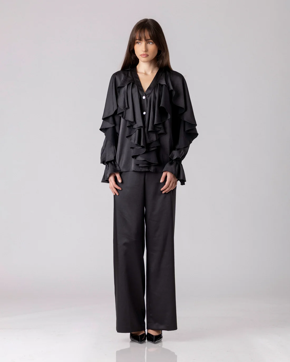 Клучниот момент на дизајнот е V-деколтето, кое внесува елегантна рамнотежа во силуетата и суптилно ја нагласува линијата на вратот и рамената. Манжетните, меко дефинирани и внимателно изработени, ја заокружуваат формата со доза на префинета женственост – детали кои ја издигнуваат блузата од едноставен моден избор во вистинска стилска изјава.