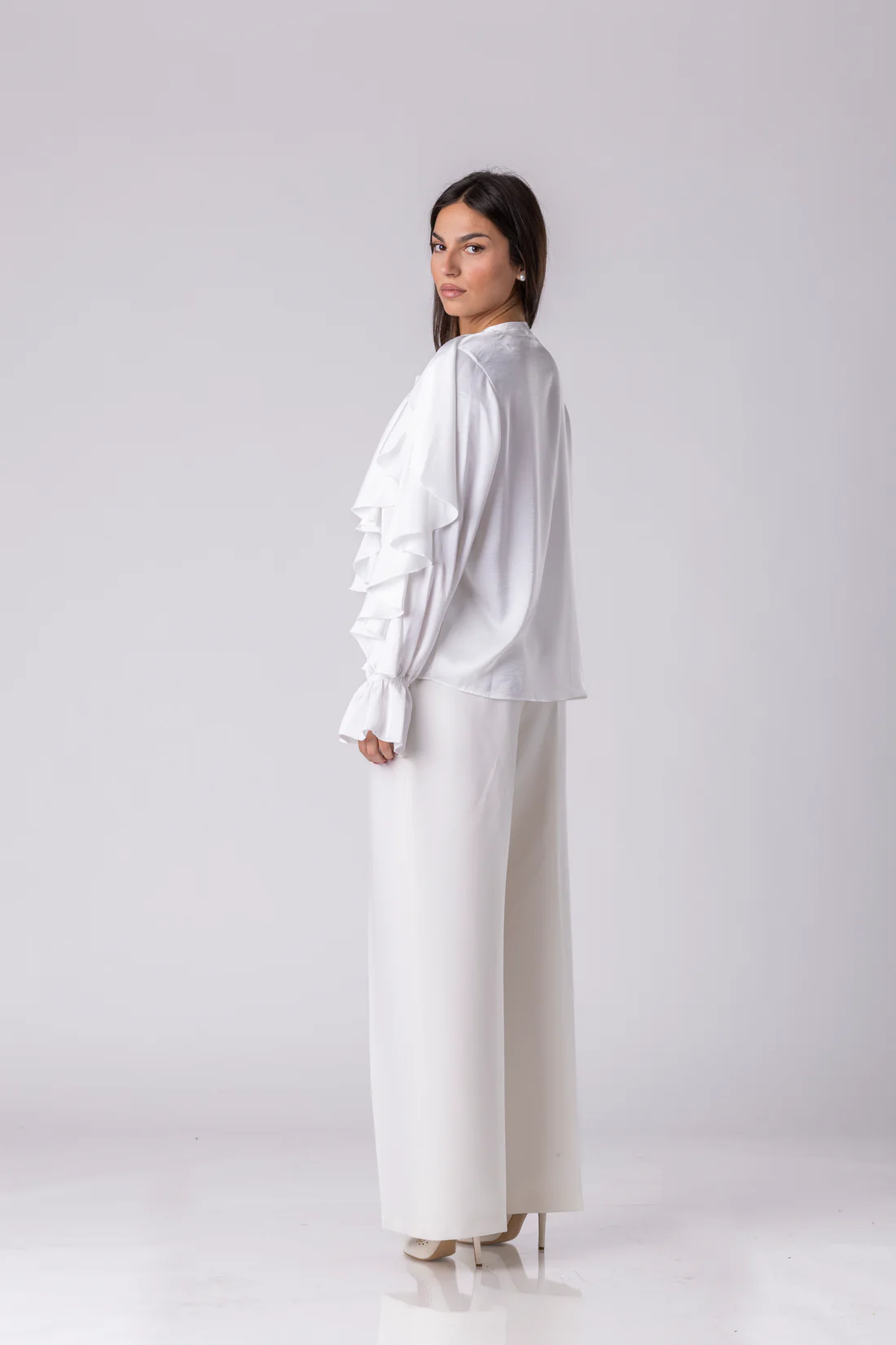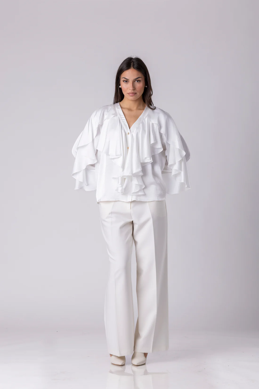 Во време кога модата сè повеќе се движи кон леснотија, движење и романтична софистицираност, YAREX се наметнува како парче што привлекува внимание уште на прв поглед. Кројот е обликуван со каскадни карнери долж предниот дел и ракавите, елемент што создава динамика и визуелна флуидност, правејќи блузата да изгледа речиси како да е во постојано движење.