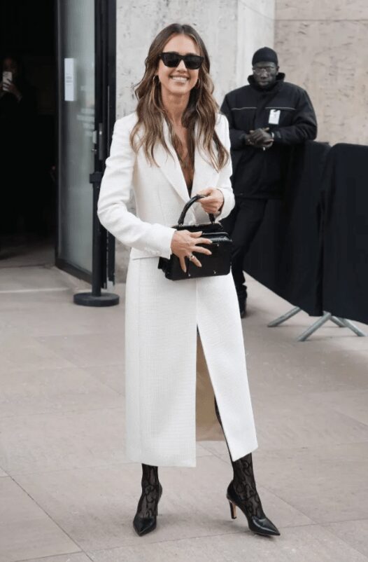 Облечена во бел капут-фустан со длабоко деколте, Џесика се издвои со тоа што под него носеше само црн чипкаст градник. Храбриот изглед го надополни со проѕирни мрежести чорапи и класични црни потпетици, визуелно издолжувајќи ја својата силуета. Комплетот го заокружи со структурирана црна чантичка и очила за сонце Wayfarer, додека нејзината препознатлива коса беше стилизирана во лежерни бранови.