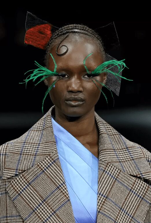 Animal motifs were a hit. At Collina Strada, faces were decorated with leopard prints, and hair was styled into "horns." Luar showed a manicure with feathers, and at Thom Browne, the eyelashes were decorated with emerald green feathers.