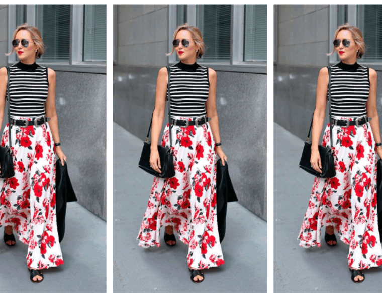 Петок е ден за разигран, цветен дезен. Нашиот денешен предлог е макси бело здолниште со црвени цветови коешто одлично се вклопува со маичка на риги, без ракави. На оваа комбинација додаваме црни…