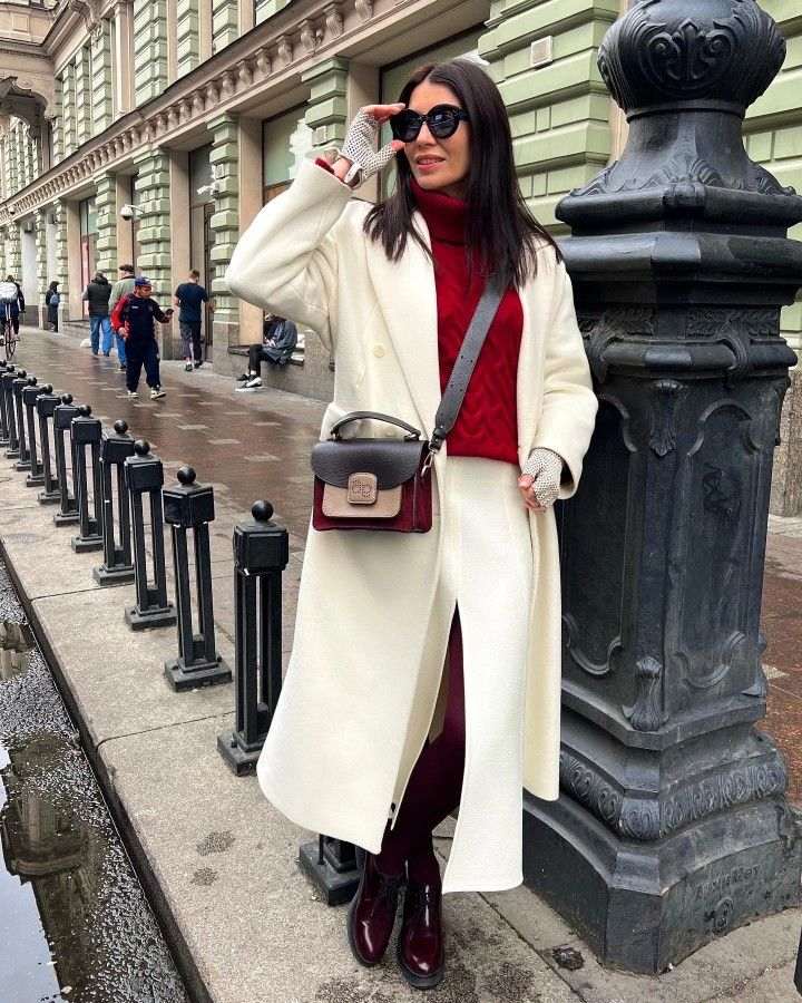 We suggest a cream skirt with a slit combined with a red turtleneck. To these two pieces, we add burgundy tights and shoes in the same shade.