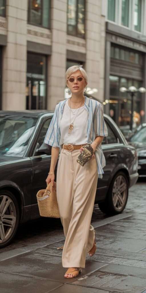 Четврток во бела и беж Четврток е ден за широки беж панталони во комбинација со бела маичка. Овие две парчиња ги дополнуваме со светла кошула на сини риги. Финишираме со светло кафен ремен, сандали во иста нијанса и сламена чанта. We wish you a nice day. Photo: Pinterest Previous Article Сите нијанси на зелена Next Article Никаде без кошула