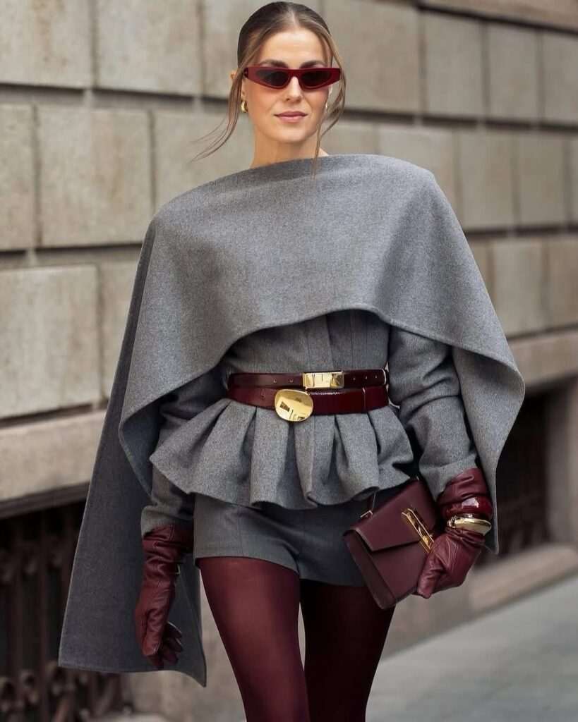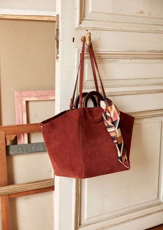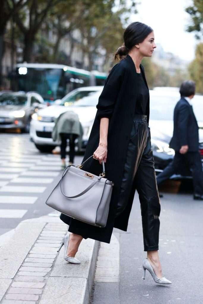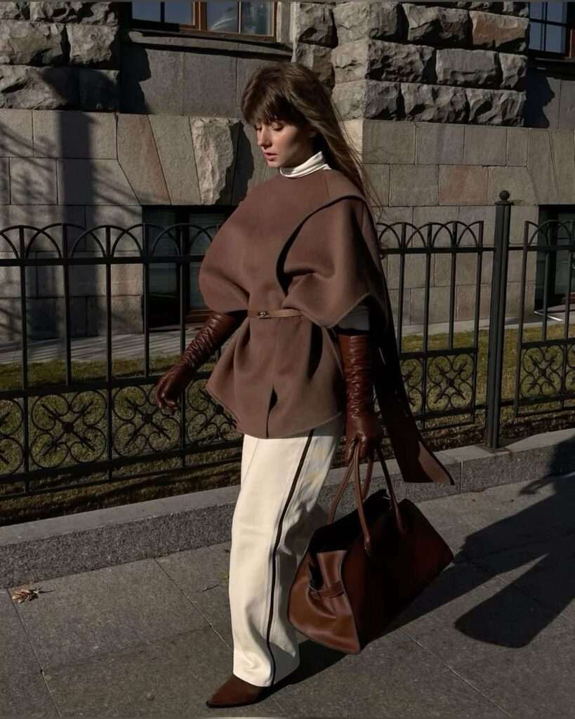 Со класичен капут или палто додајте контрастна чанта. На пример, бордо чанта со беж капут, или смарагдно зелена со темносив. Тоа создава рафиниран, модерен баланс. Со џемпери и плетени фустани,топлите текстури на есента прекрасно се вклопуваат со чанти од велур, кожа или платно во боја. Сенф-жолта или боја на вино ќе даде совршен акцент.