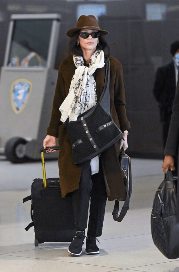 On Tuesday, Zeta-Jones was photographed at JFK Airport in New York City wearing a luxurious chocolate brown coat and a perfectly matching hat. Her look was completed with black structured but comfortable trousers, sleek black sneakers, and a light cream scarf with a brown and gray pattern, casually wrapped around her neck.
