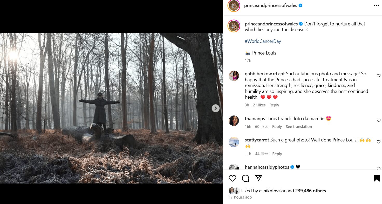 On the occasion of World Cancer Day - February 4, Princess Kate Middleton, who bravely faced the disease last year, shared an emotional message and a powerful photo taken by her son, Prince Louis.
