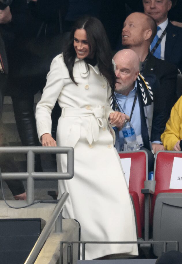 Markle graced the event in a striking white double-breasted coat from Sentaler, a luxury clothing brand she has worn frequently over the years. With its refined alpaca and wool design, accented with buttons, it perfectly showcased her signature sophisticated style. The coat looked timeless, especially paired with an elegant, black knit dress that allowed the top garment to take center stage.