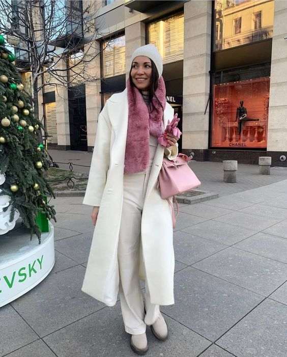 Our suggestion is cream pants and a turtleneck to which we add a maxi light coat and cream-colored flat boots.