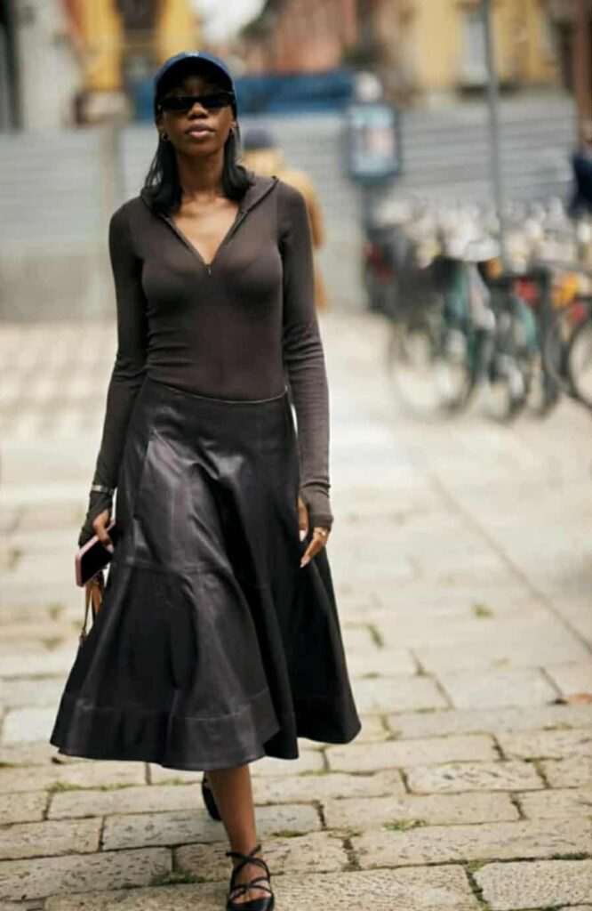 Кожните trench палта и јакни беа апсолутен хит – носени со широки панталони, давајќи моќна, женствена силуета.
