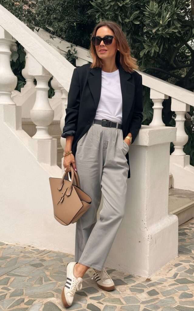 На овие две парчиња облека додаваме црн блејзер и ремен во иста боја. Спортско елегантниот стајлинг го заокружуваме со патики и беж чанта.