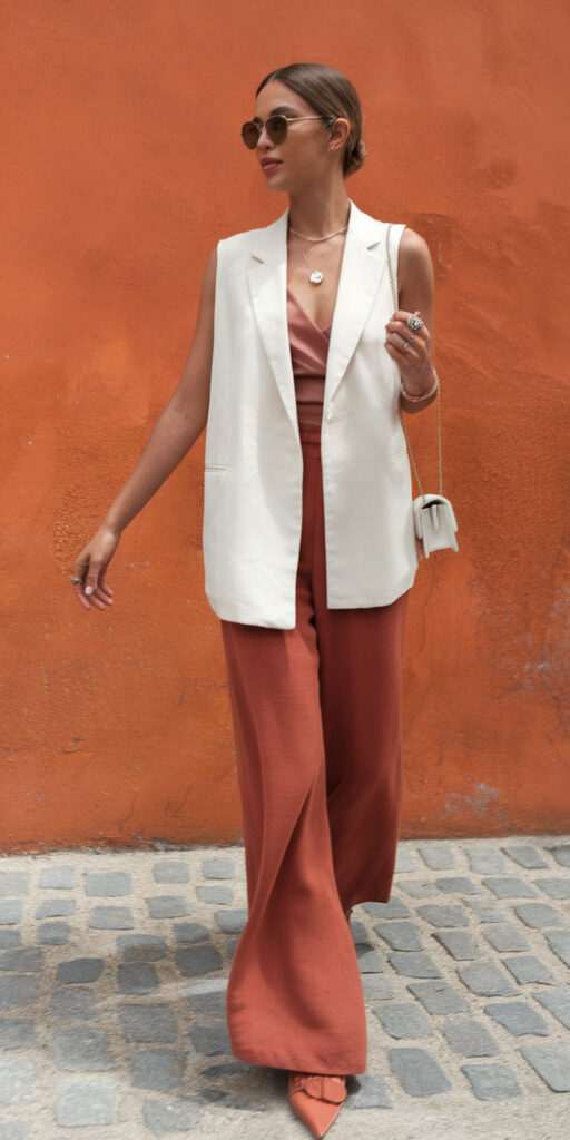 На оваа елегантна комбинација додаваме и бело елече за шик нота.