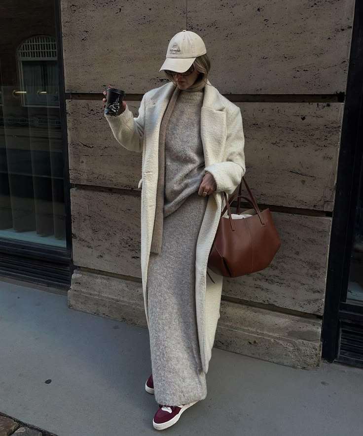 Styled like this, we add a beige coat and a sports cap, and finish with burgundy sneakers and a brown bag.