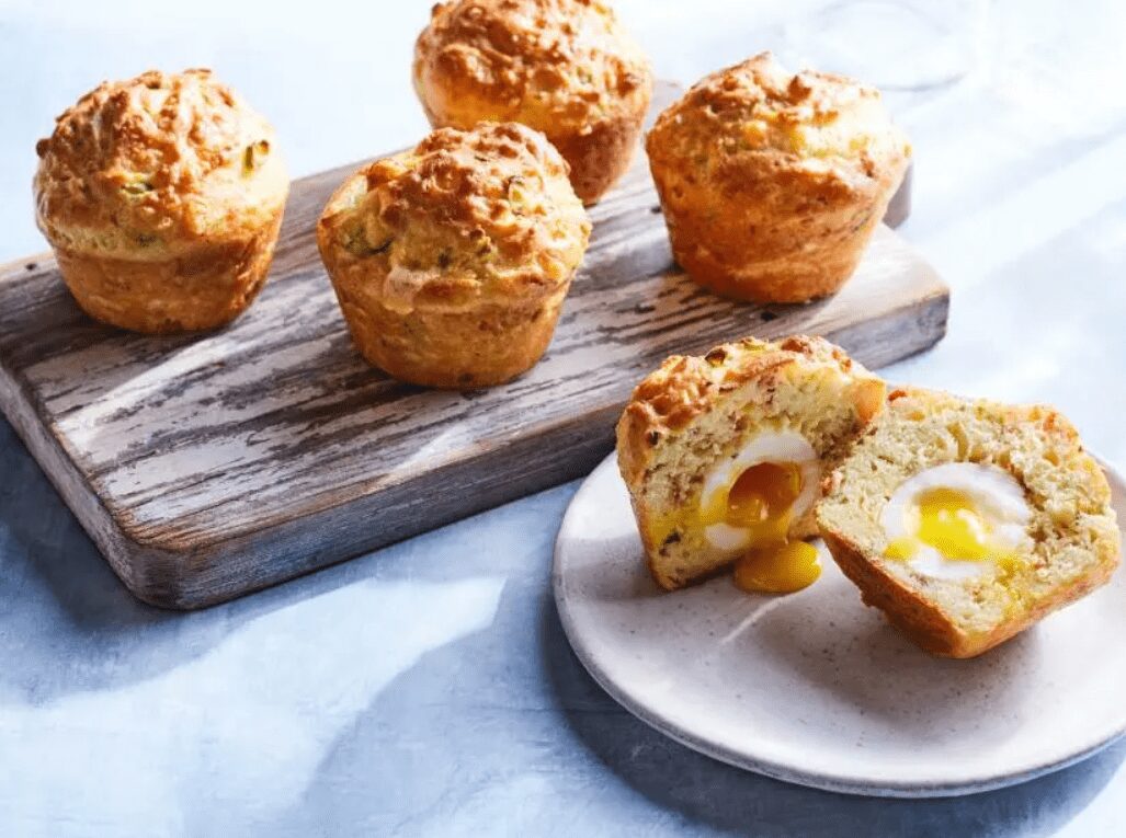 Preheat the oven to 220°C and grease a 6-cup muffin tin with butter. In a bowl, mix the flour, baking powder, salt, baking soda, black pepper and sugar. In another bowl, beat the remaining 4 eggs with the oil and yoghurt. Add the dry mixture and mix lightly, then stir in the grated cheese, Parmesan, spring onion and bacon.