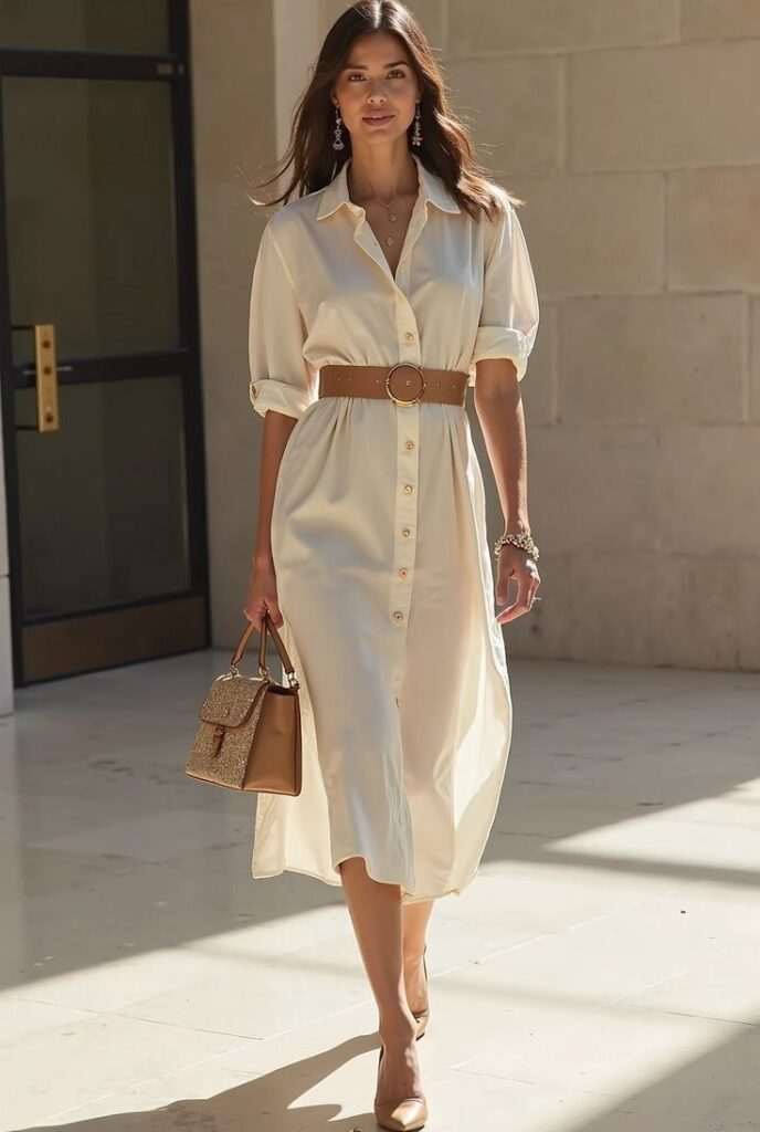 Понеделнички стартуваме со лесна, летна комбинација. Денешниот стајлинг се состои од елегантен фустан кошула во кремава нијанса.