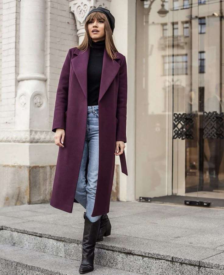 We finish the styling with a coat in a pastel purple shade and a black beret.