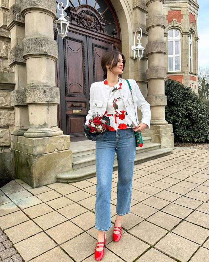 Понеделник во џинс и цветна кошула Понеделнички ќе стартуваме со фармерки и кошула со цветен дезен. На овие две парчиња облека ќе додадеме елегантен бел блејзер. Стајлингот ќе го дополниме со црвени чевли на ремче и мини тиркизна чанта. We wish you a nice day. Photo: Pinterest Previous Article Петок во мантил и панталони Next Article Пролет во беж