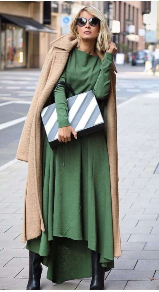 Фустанот ќе го дополниме со крем капут и црни чизми под колена.