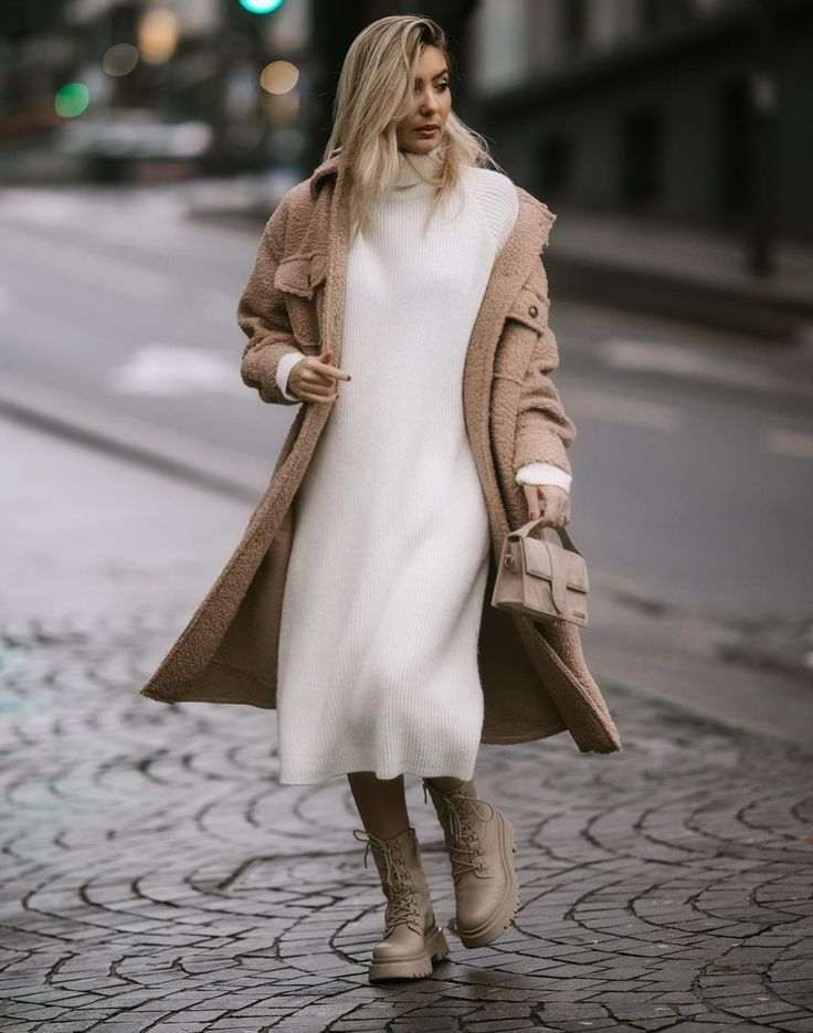 We combine this warm piece of clothing with beige martin boots that match perfectly.