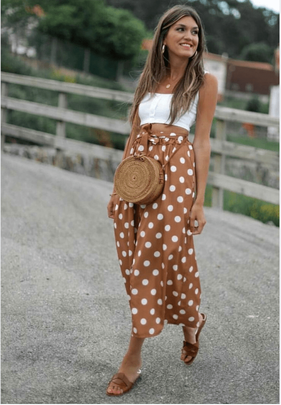 Понеделнички носиме бел кроп-топ којшто го комбинираме со светло кафено здолниште со бели точки.