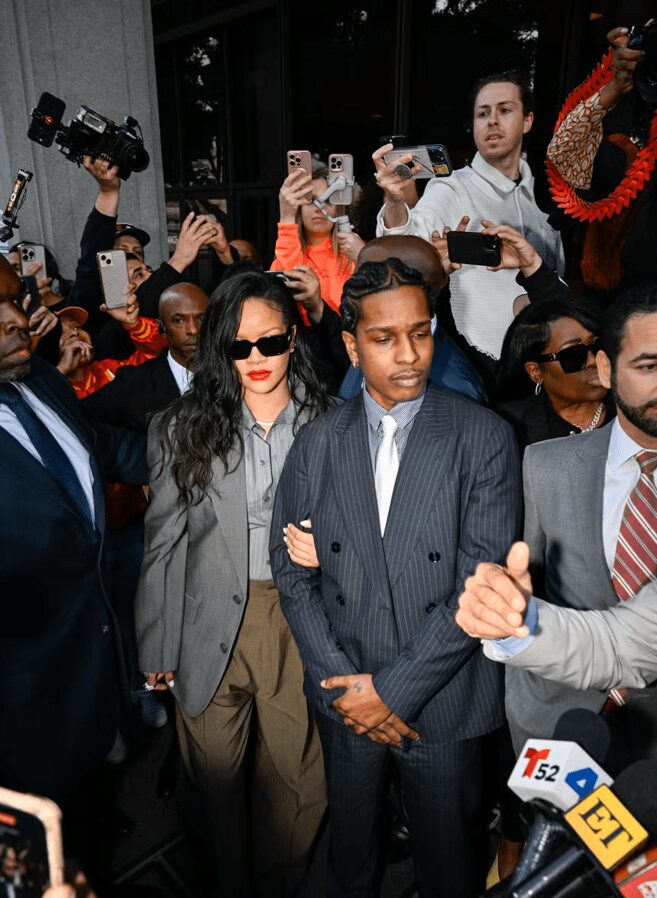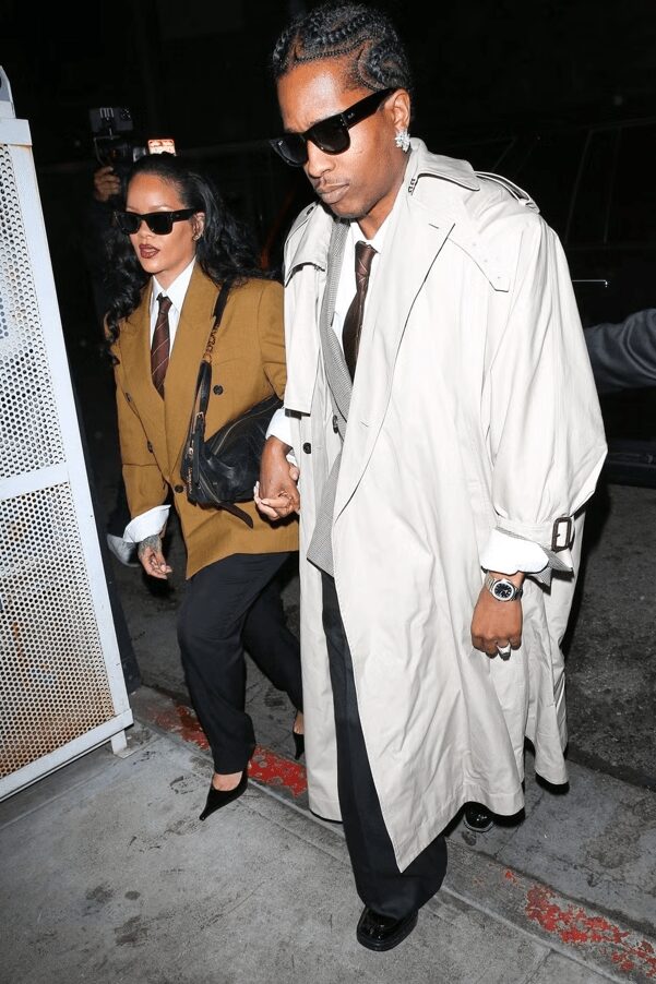 Rocky followed her aesthetic, pairing a light gray blazer under a trendy stone-colored coat, the same burgundy tie, and Ray-Ban sunglasses. This isn't the first time the couple has opted for sophisticated, costume-inspired elegance; just days earlier, the pair dazzled in another matching suit look.