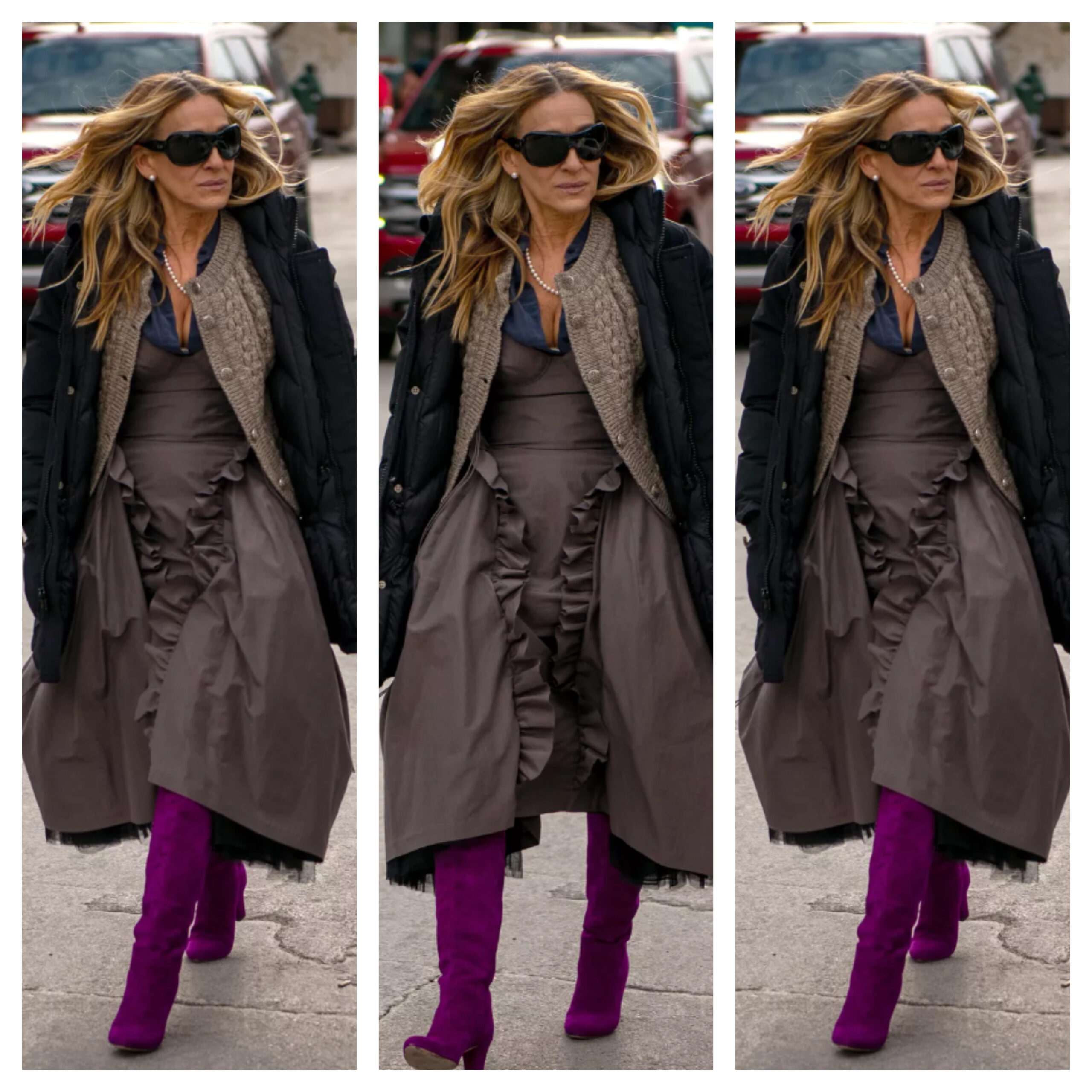 But the real star of her look was her bold, bright purple thigh-high boots, which added a vibrant contrast to her outfit. Made from a luxurious suede-like material, the boots offered the perfect balance between style and comfort, thanks to their chunky heel. The pointed toe and slightly gathered detailing gave them a contemporary edge, bringing the signature bold style that Carrie Bradshaw fans love.