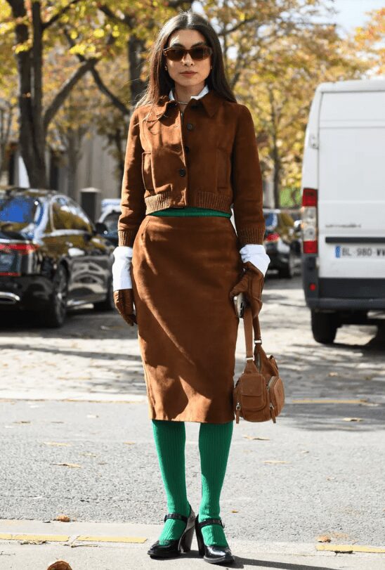 Choose tights that match your skirts or pants for a striking yet casual look. This combination gives the impression of sophistication and attention to detail.