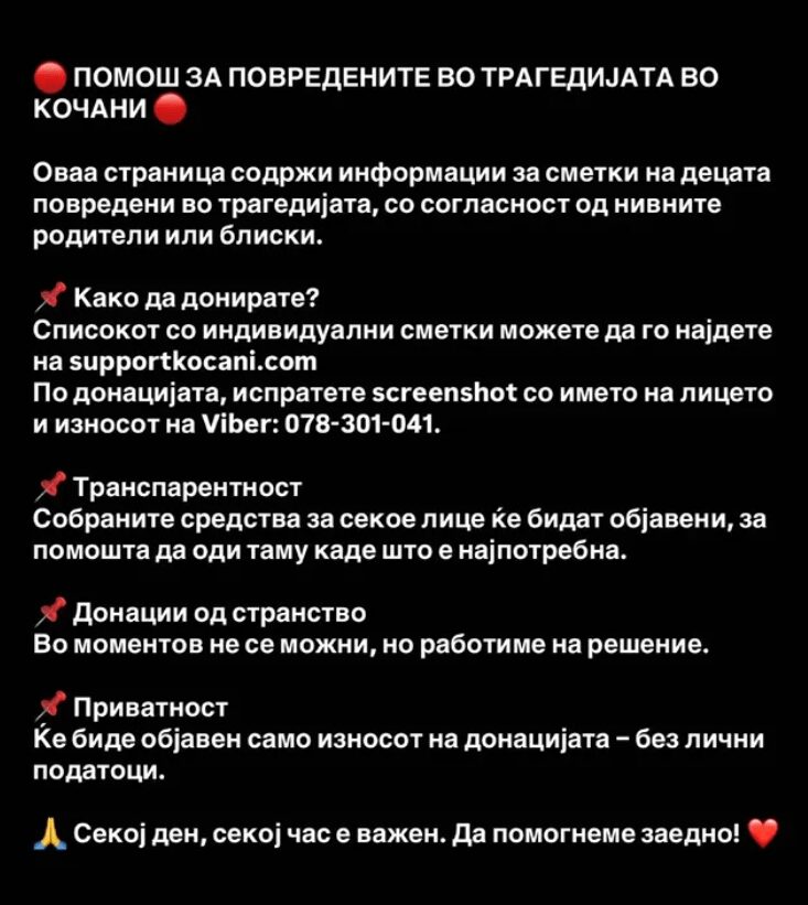 Секој кој сака да помогне, може да го направи тоа преку платформата www.supportkocani.com, бидејќи секоја донација значи надеж за подобро утре за сите повредени кои во моментов се наоѓаат на болничко лекување.