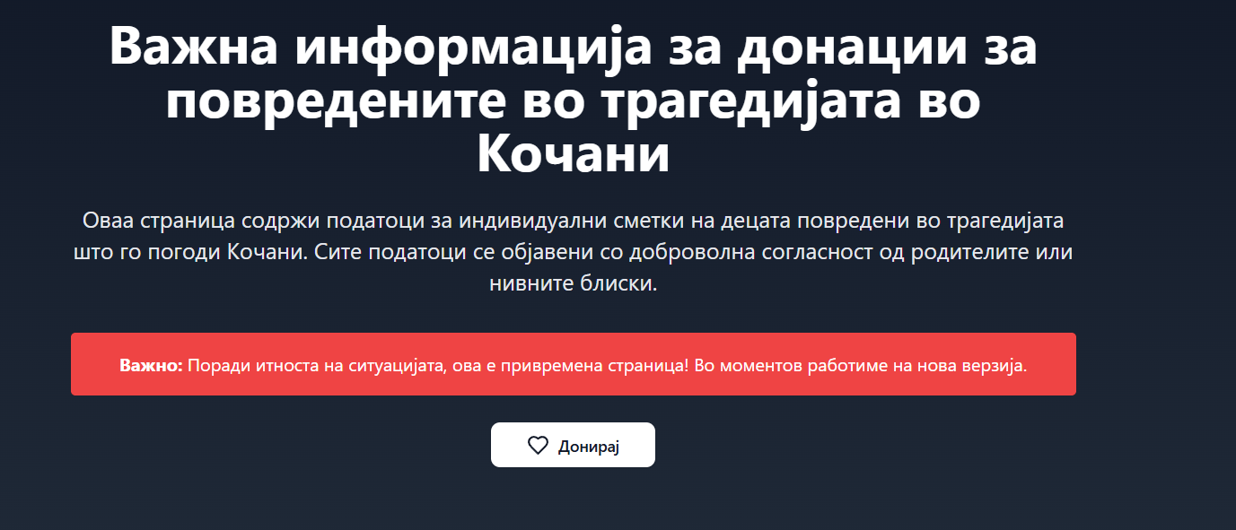 На страницата се објавени индивидуалните сметки на повредените, со доброволна согласност од нивните родители или блиски, а приватноста на донаторите е целосно заштитена.